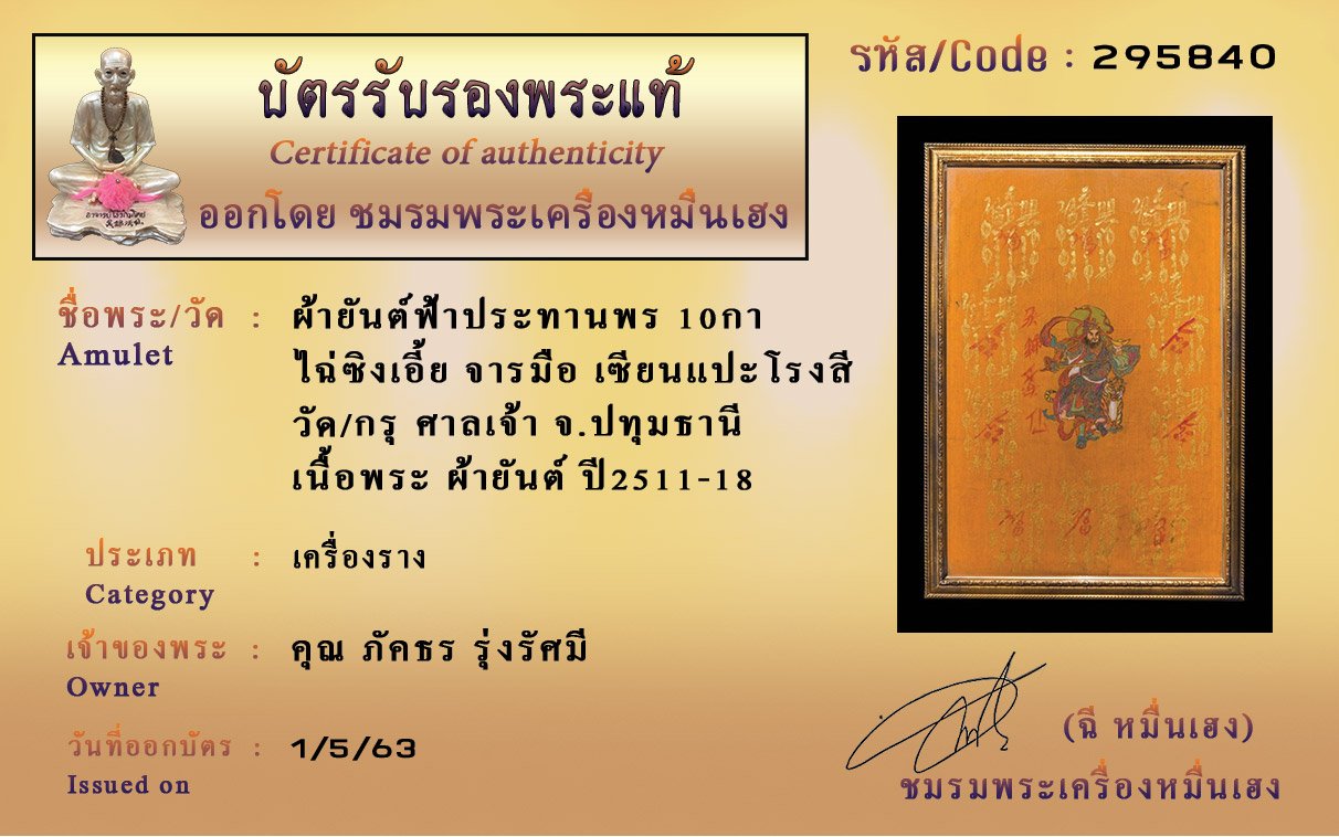 รหัสสินค้า : (295840) ผ้ายันต์ฟ้าประทานพร 10กา ไฉ่ซิงเอี้ย จารมือ เซียนแปะโรงสี วัด/กรุ ศาลเจ้า จ.ปทุมธานี เนื้อพระ ผ้ายันต์ ปี2511-18