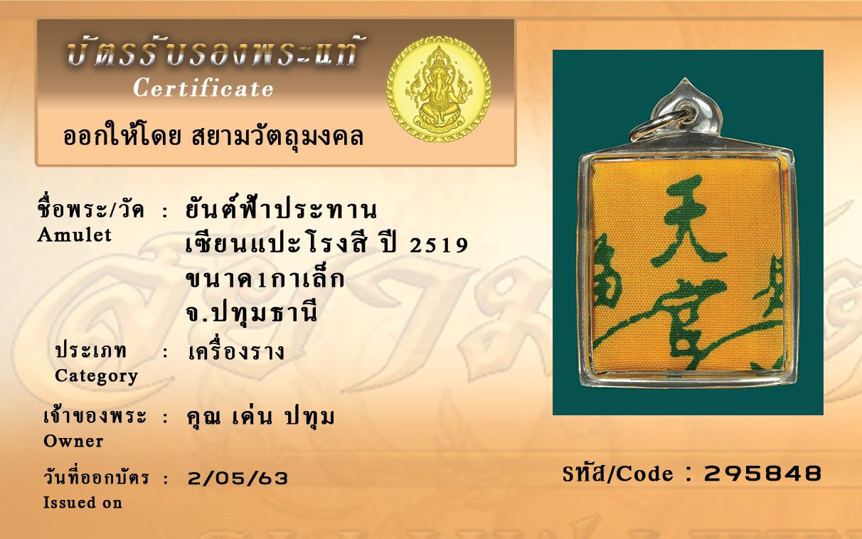 รหัสสินค้า : (295848) ยันต์ฟ้าประทาน เซียนแปะโรงสี ขนาด1กาเล็ก ปี 2519 จังหวัดปทุมธานี