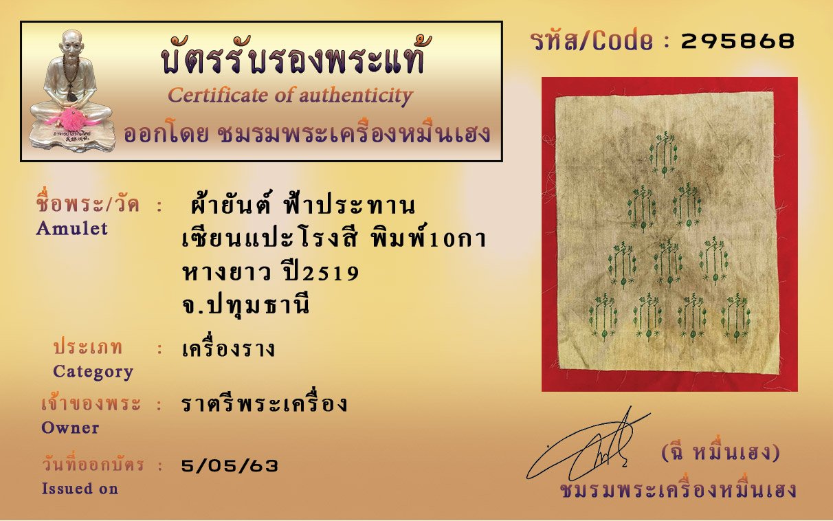 รหัสสินค้า : (295868) ผ้ายันต์ ฟ้าประทาน เซียนแปะโรงสี พิมพ์10กาหางยาวปี2519 จังหวัดปทุมธานี