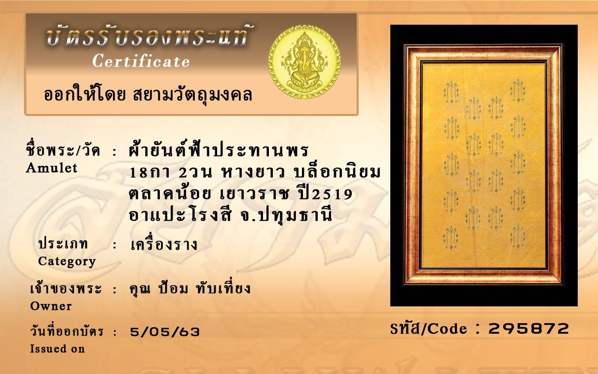 รหัสสินค้า : (295872) ผ้ายันต์ฟ้าประทานพร18กา 2วน หางยาว บล็อกนิยม ตลาดน้อย เยาวราช ปี2519 อาแปะโรงสี จังหวัดปทุมธานี