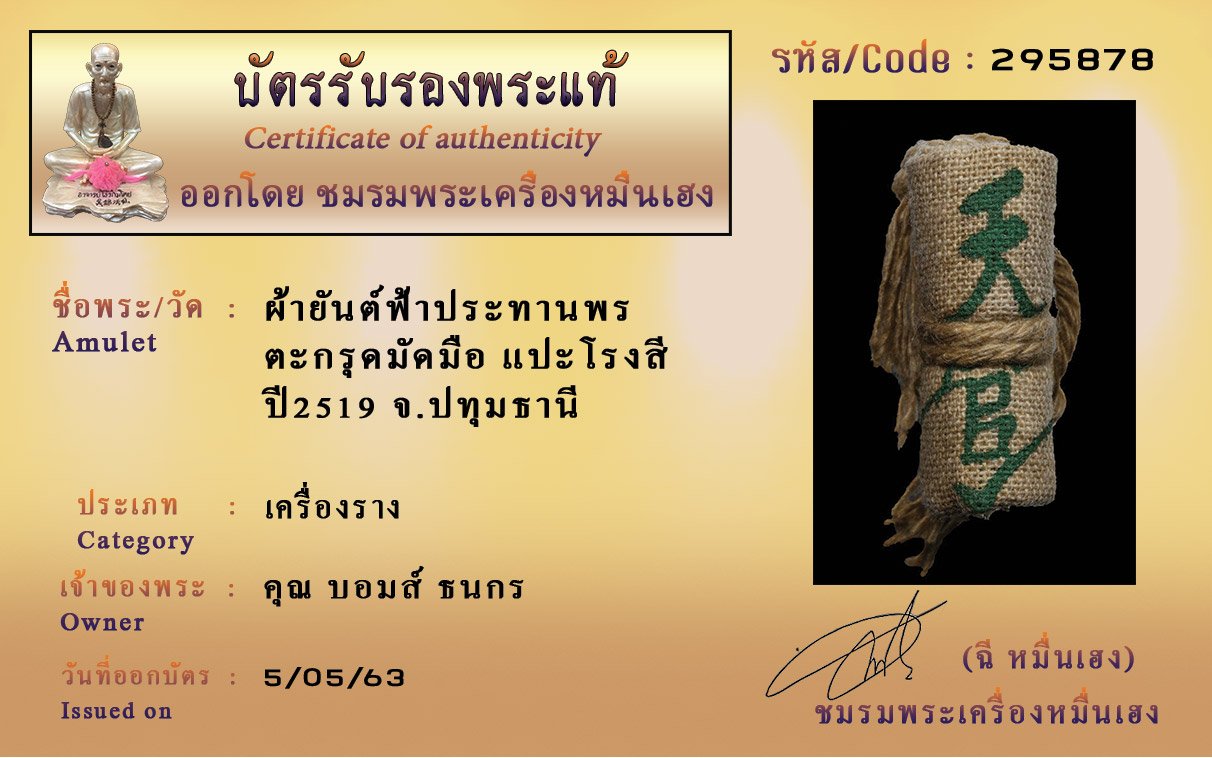 รหัสสินค้า : (295878) ผ้ายันต์ฟ้าประทานพร ตะกรุดมัดมือ แปะโรงสี ปี2519 จ.ปทุมธานี