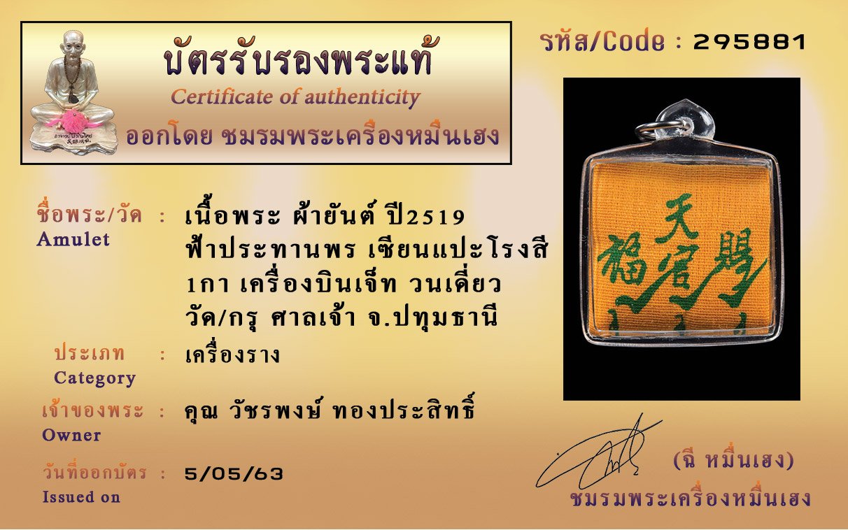 รหัสสินค้า : (295881) เนื้อพระ ผ้ายันต์ ปี2519 ฟ้าประทานพร เซียนแปะโรงสี 1กา เครื่องบินเจ็ท วนเดี่ยว วัด/กรุ ศาลเจ้า จ.ปทุมธานี