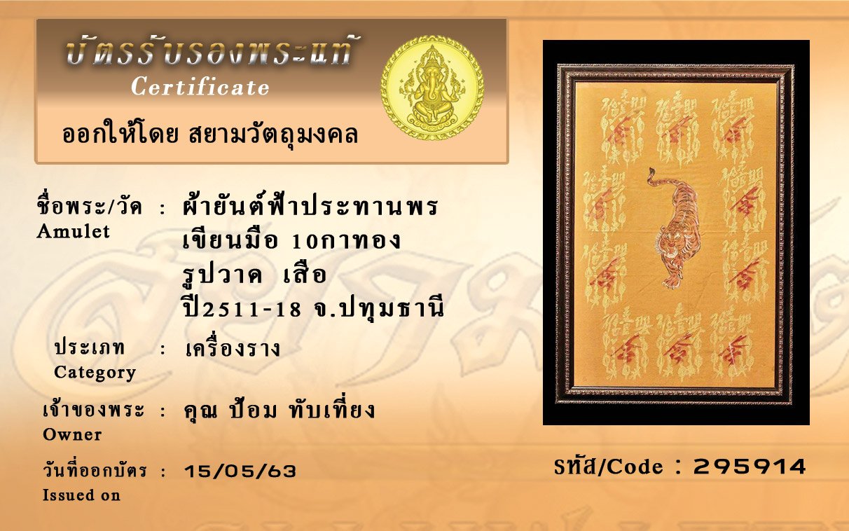 รหัสสินค้า : (295914) ผ้ายันต์ฟ้าประทานพร เขียนมือ10กา ทอง รูปวาด เสือ ปี11-18 จ.ปทุมธานี