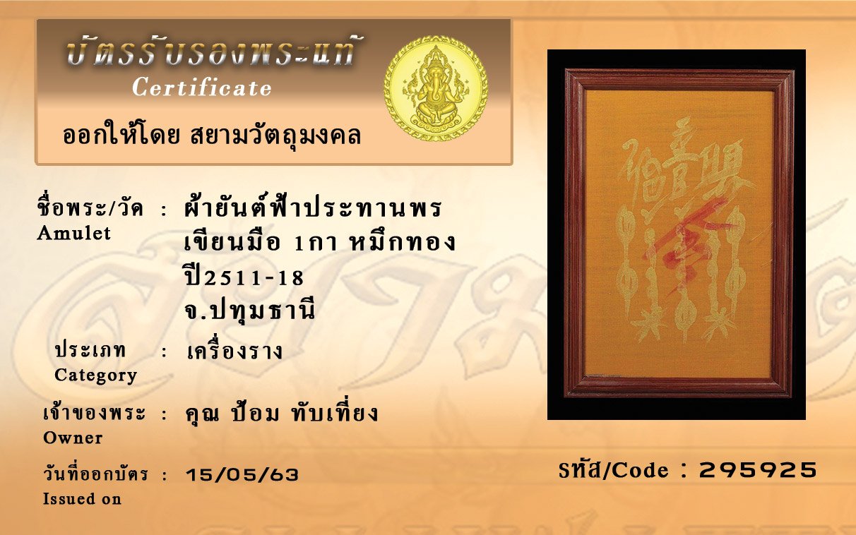 รหัสสินค้า : (295925) ผ้ายันต์ฟ้าประทานพร เขียนมือ 1กา แปะโรงสี หมึกทอง ปี2511-18 จ.ปทุมธานี