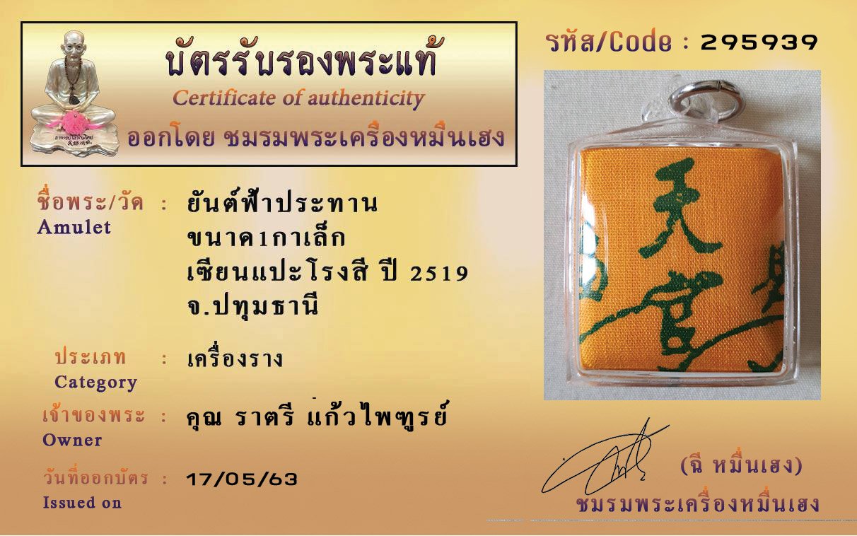 รหัสสินค้า : (295939) ยันต์ฟ้าประทาน เซียนแปะโรงสี ปี 2519 ขนาด 1กาเล็ก จ.ปทุมธานี