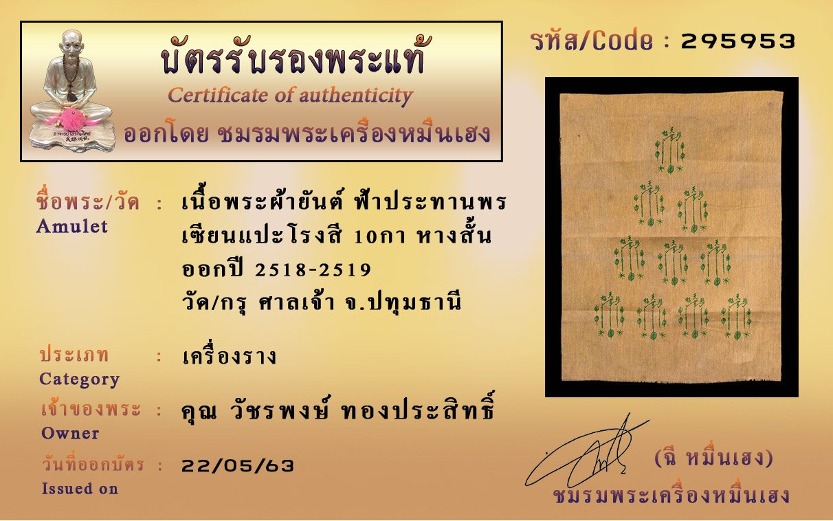 รหัสสินค้า : (295953) ผ้ายันต์ฟ้าประทานพร 10กา เซียนแปะโรงสี หางสั้น วัด/กรุ ศาลเจ้า จ.ปทุมธานี เนื้อพระ ผ้ายันต์ ออกปี2518-19