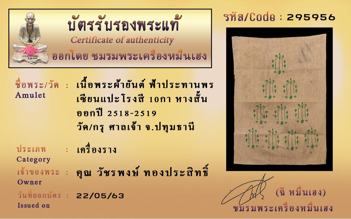 รหัสสินค้า : (295956) ผ้ายันต์ฟ้าประทานพร 10กา เซียนแปะโรงสี หางสั้น วัด/กรุ ศาลเจ้า จ.ปทุมธานี เนื้อพระ ผ้ายันต์ ออกปี2518-19