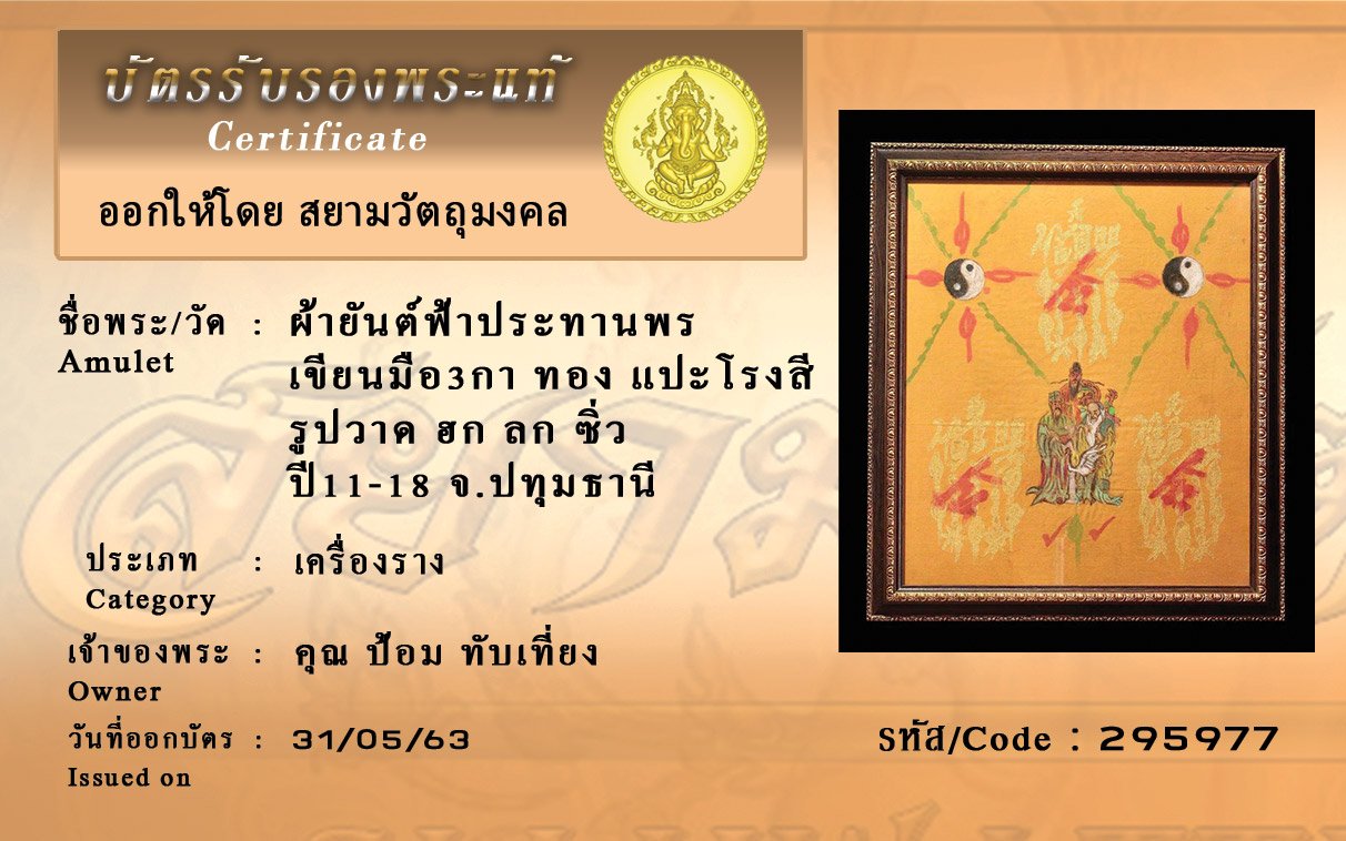 รหัสสินค้า : (295977) ผ้ายันต์ฟ้าประทานพร เขียนมือ3กา ทอง แปะโรงสี รูปวาด ฮก ลก ซิ่ว ปี11-18 จังหวัดปทุมธานี