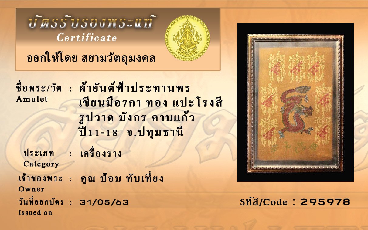 รหัสสินค้า : (295978) ผ้ายันต์ฟ้าประทานพร เขียนมือ7กา ทอง แปะโรงสี รูปวาด มังกร คาบแก้ว ปี11-18 จังหวัดปทุมธานี