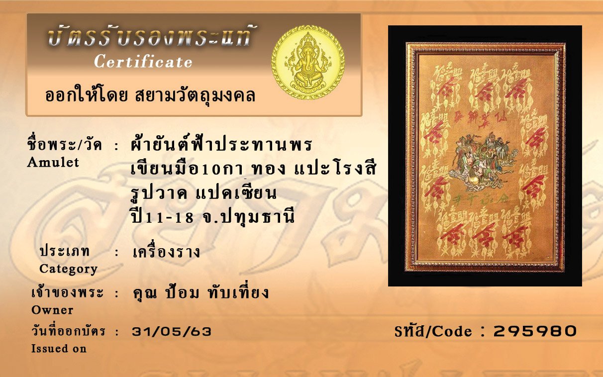 รหัสสินค้า : (295980) ผ้ายันต์ฟ้าประทานพร เขียนมือ10กา ทอง แปะโรงสี รูปวาด แปดเขียน ปี11-18 จังหวัดปทุมธานี