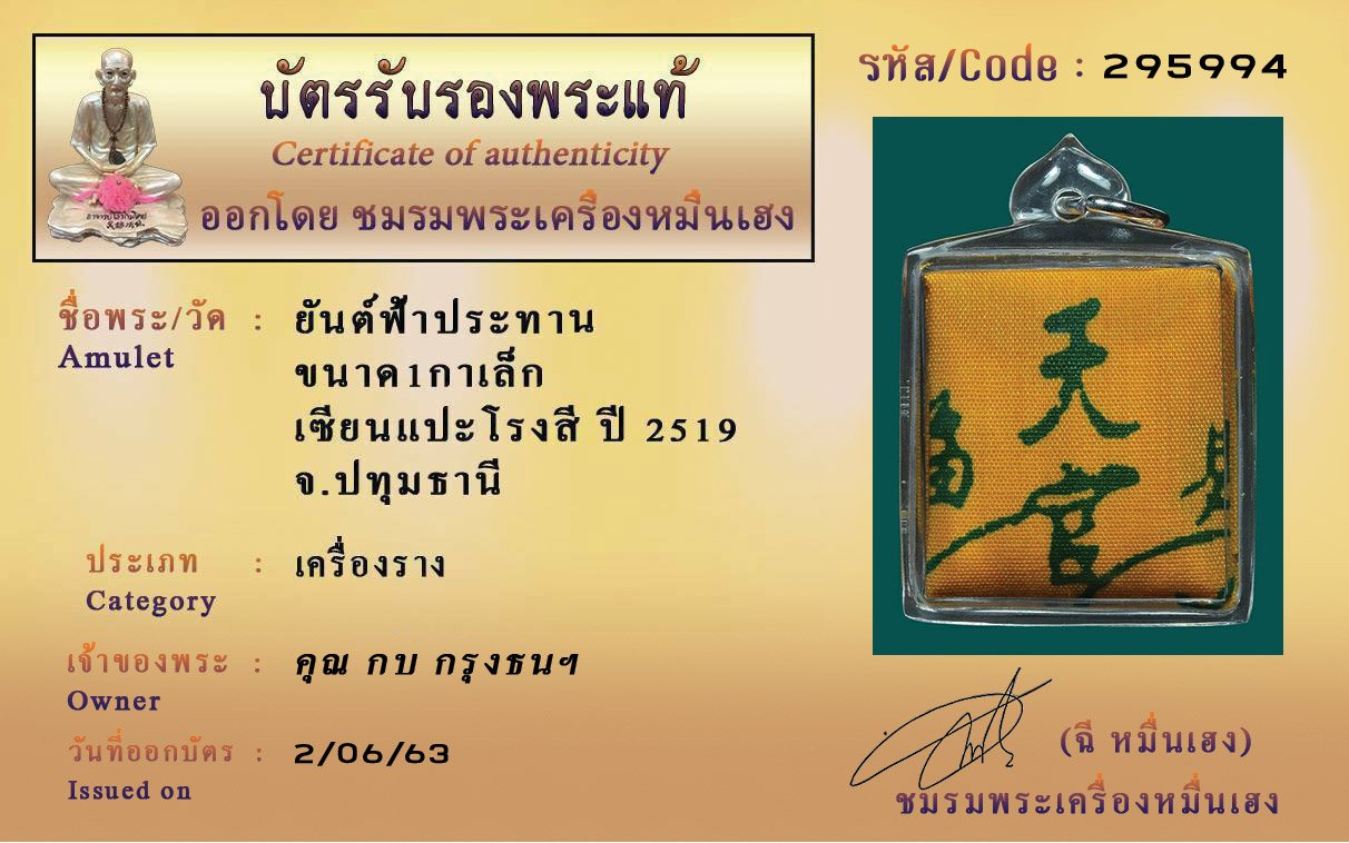 รหัสสินค้า : (295994) ยันต์ฟ้าประทาน ขนาด 1กาเล็ก เซียนแปะโรงสี ปี2519 จ.ปทุมธานี