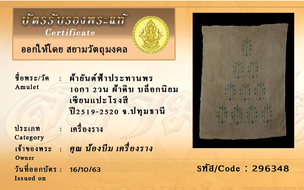 รหัสสินค้า : 296348 ผ้ายันต์ฟ้าประทานพร 10กา 2วน ผ้าดิบ บล็อกนิยม เซียนแปะโรงสี ปี2519-2520 จ.ปทุมธานี