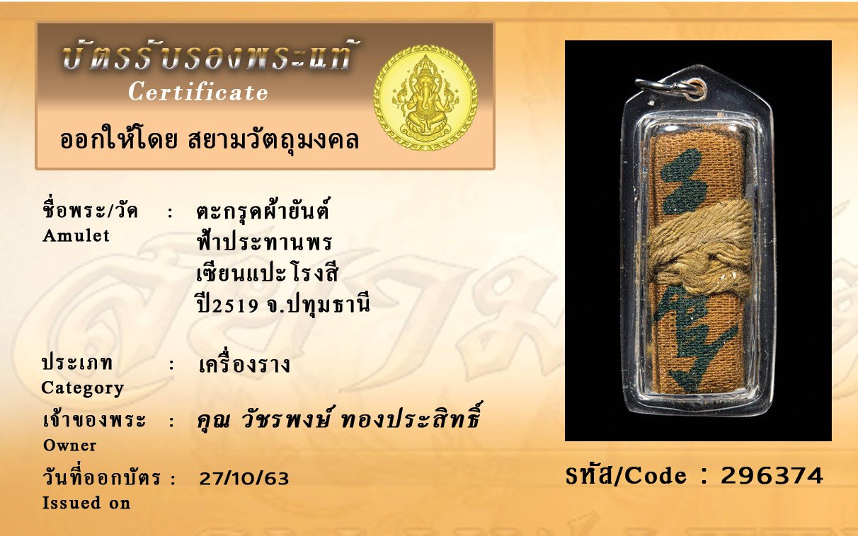 รหัสสินค้า : 296374 ตะกรุดผ้ายันต์ ฟ้าประทานพร เซียนแปะโรงสี ปี2519 จ.ปทุมธานี