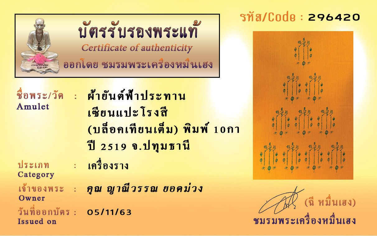 รหัสสินค้า : 296420 ผ้ายันต์ฟ้าประทาน เซียนแปะโรงสี(บล็อคเทียนเต็ม) พิมพ์ 10 กา ปี 2519 จังหวัดปทุมธานี