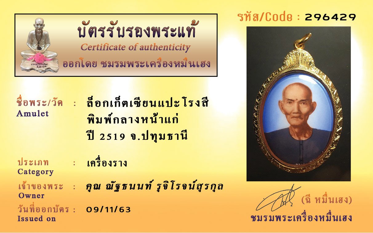รหัสสินค้า : 296429 ล็อกเก็ตเซียนแปะโรงสี พิมพ์กลางหน้าแก่ ปี 2519 จ.ปทุมธานี