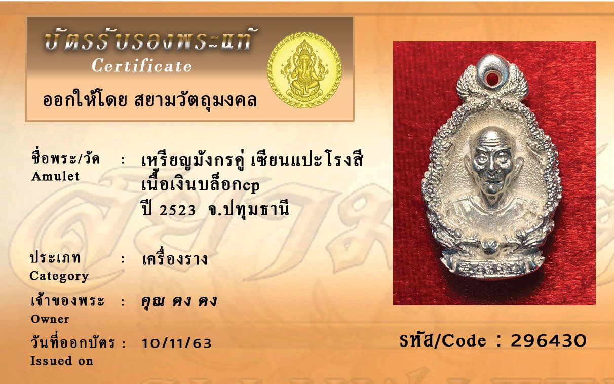 รหัสสินค้า : 296430 เหรียญมังกรคู่ เซียนแปะโรงสี เนื้อเงินบล็อกcp ปีพศ 2523 จังหวัดปทุมธานี