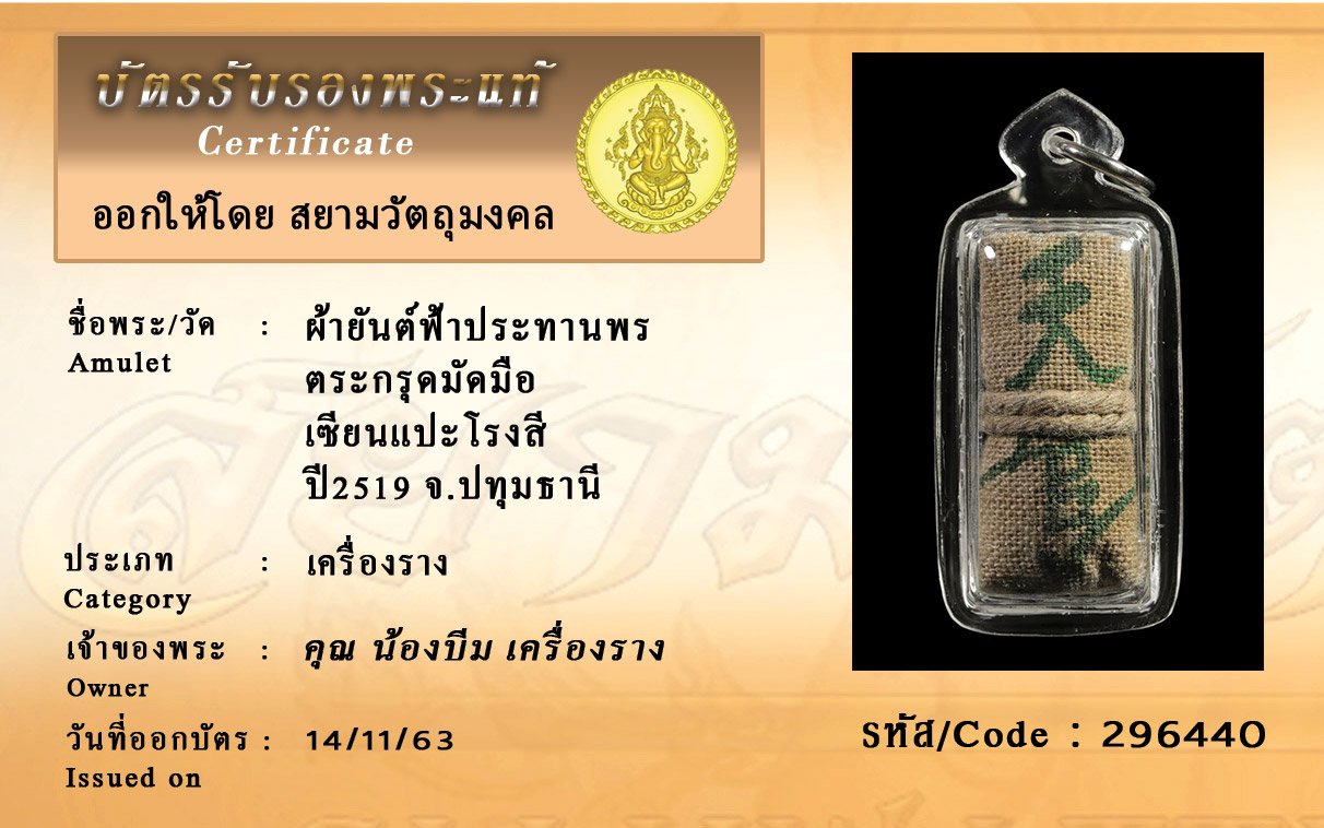 รหัสสินค้า : 296440 ผ้ายันต์ฟ้าประทานพร ตระกรุดมัดมือ เซียนแปะโรงสี ปี2519 จ.ปทุมธานี