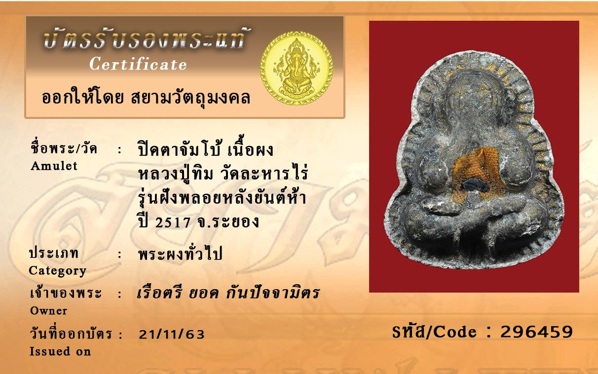 รหัสสินค้า : 296459 ปิดตาจัมโบ้ เนื้อผง หลวงปู่ทิม วัดละหารไร่ รุ่นฝังพลอยหลังยันต์ห้า ปี 2517 จ.ระยอง