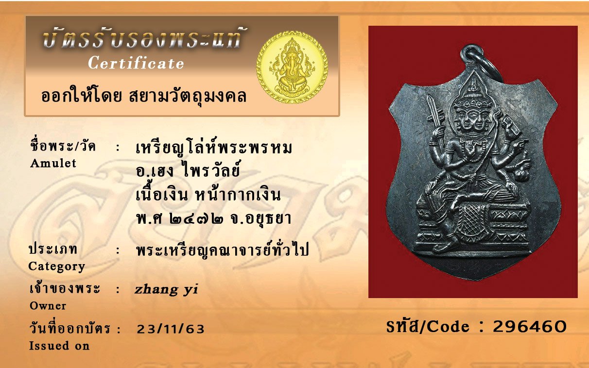 รหัสสินค้า : 296460 เหรียญโล่ห์พระพรหม อ.เฮง ไพรวัลย์ เนื้อเงิน หน้ากากเงิน พ.ศ ๒๔๗๒ จ.อยุธยา