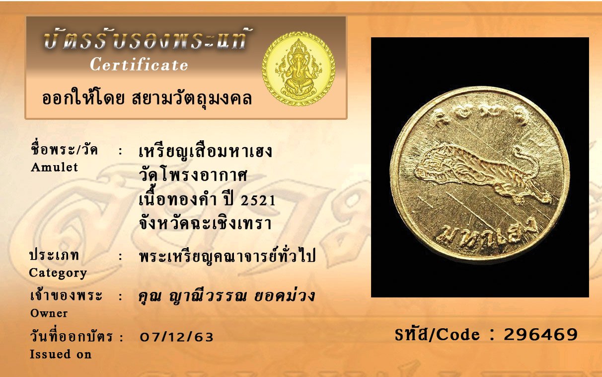 รหัสสินค้า : 296469 เหรียญเสือมหาเฮง วัดโพรงอากาศ เนื้อทองคำ ปี พ. ศ. 2521 จังหวัดฉะเชิงเทรา