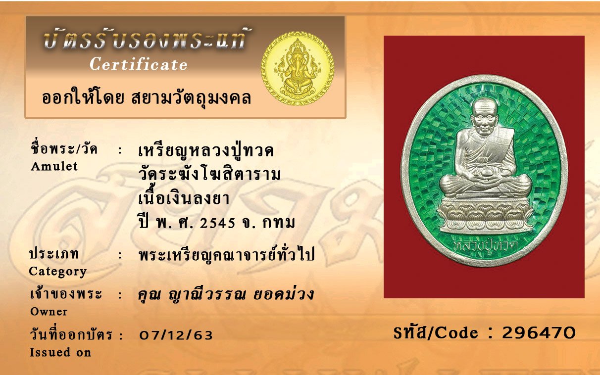 รหัสสินค้า : 296470 เหรียญหลวงปู่ทวด วัดระฆังโฆสิตาราม เนื้อเงินลงยา ปี พ. ศ. 2545 กทม