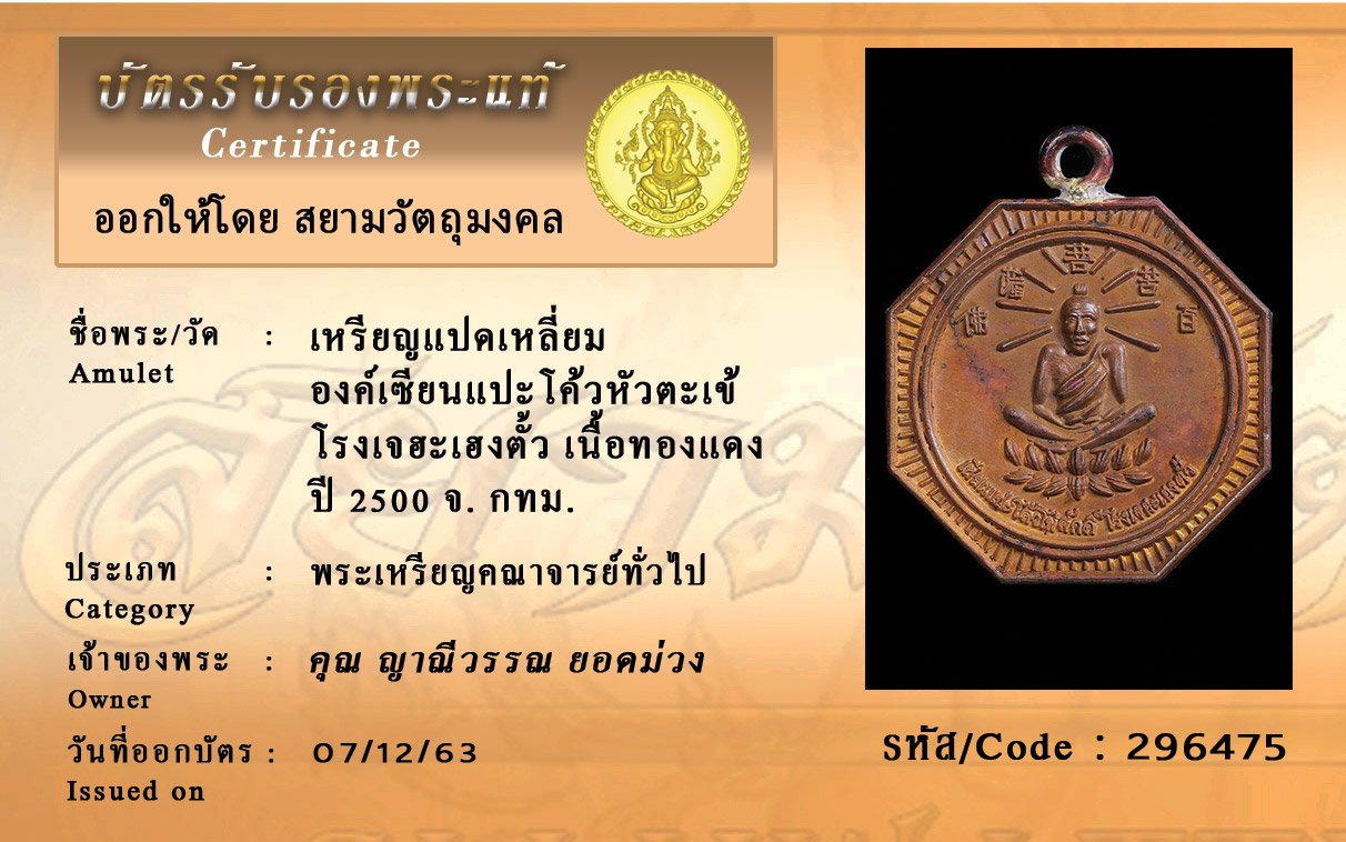รหัสสินค้า : 296475 เหรียญแปดเหลี่ยมองค์เซียนแปะโค้วหัวตะเข้ โรงเจฮะเฮงตั้ว ปีพศ 2500 เนื้อทองแดง จ.กทม