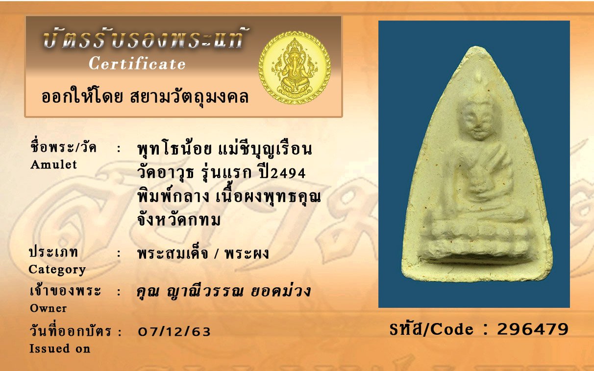 รหัสสินค้า : 296479 พุทโธน้อย แม่ชีบุญเรือน วัดอาวุธ รุ่นแรก ปี2494 พิมพ์กลาง เนื้อผงพุทธคุณ จังหวัดกทม