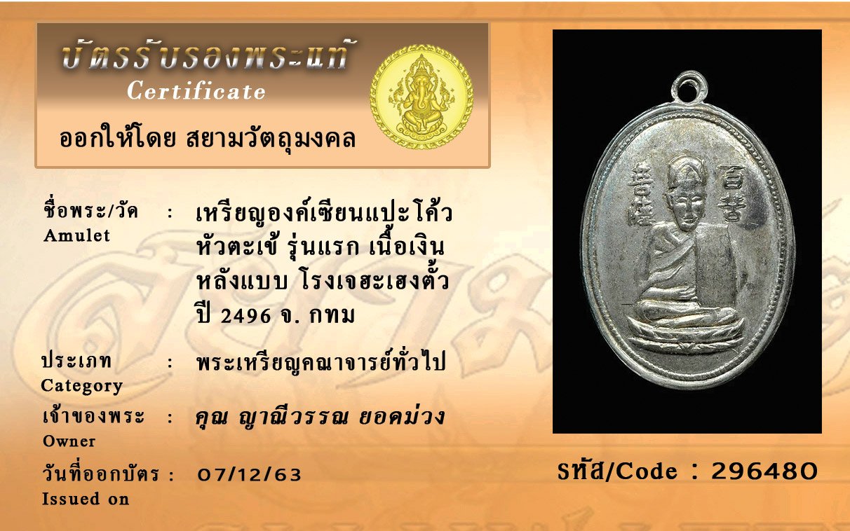 รหัสสินค้า : 296480 เหรียญองค์เซียนแปะโค้วหัวตะเข้รุ่นแรก เนื้อเงิน ปีพ.ศ 2496 หลังแบบ โรงเจฮะเฮงตั้ว กทม