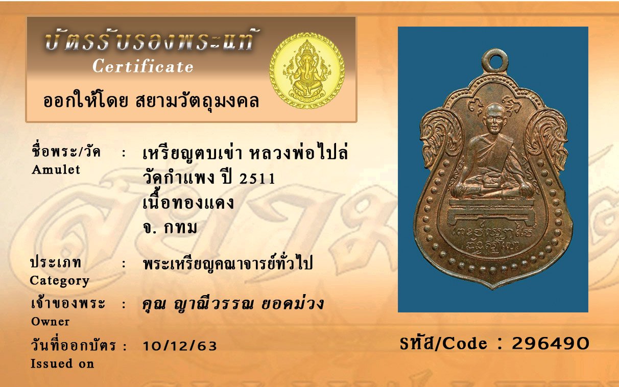 รหัสสินค้า : 296490 เหรียญตบเข่าหลวงพ่อไปล่วัดกำแพงปีพศ 2511 เนื้อทองแดงกทม