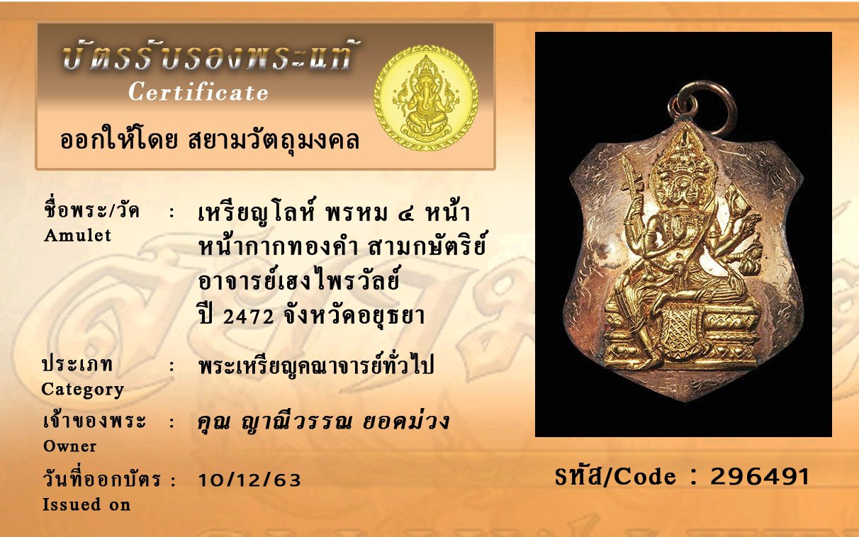 รหัสสินค้า : 296491 เหรียญโลห์พรหมสี่หน้า หน้ากากทองคำ สามกษัตริย์ อาจารย์เฮงไพรวัลย์ พ. ศ. 2472 จังหวัดอยุธยา