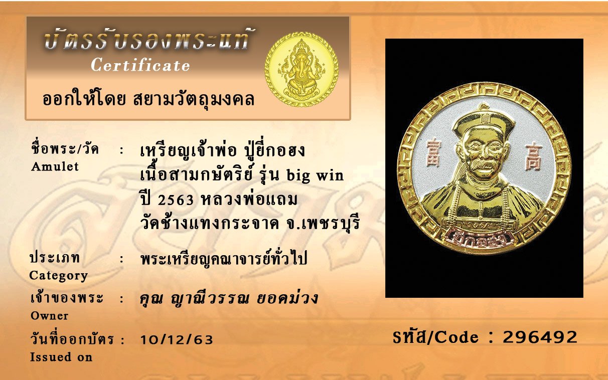 รหัสสินค้า : 296492 เหรียญเจ้าพ่อปู่ยี่กอฮง เนื้อสามกษัตริย์ รุ่น big win พ. ศ. 2563 หลวงพ่อแถมวัดช้างแทงกระจาด จังหวัดเพชรบุรี