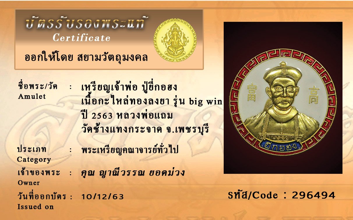 รหัสสินค้า : 296494 เหรียญเจ้าพ่อปู่ยี่กอฮง เนื้อ กะไหล่ทองลงยา รุ่น big win พ. ศ. 2563 หลวงพ่อแถมวัดช้างแทงกระจาด จังหวัดเพชรบุรี