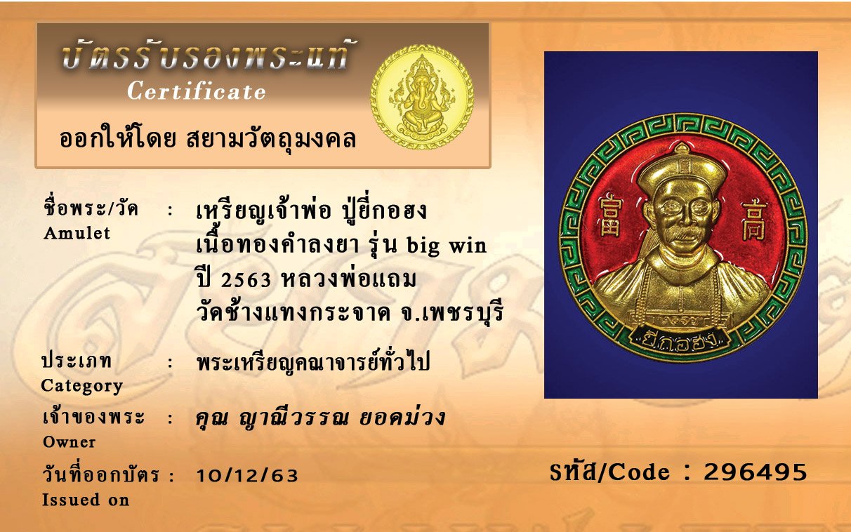 รหัสสินค้า : 296495 เหรียญเจ้าพ่อปู่ยี่กอฮง เนื้อทองคำรุ่น big win พ. ศ. 2563 หลวงพ่อแถมวัดช้างแทงกระจาด จังหวัดเพชรบุรี