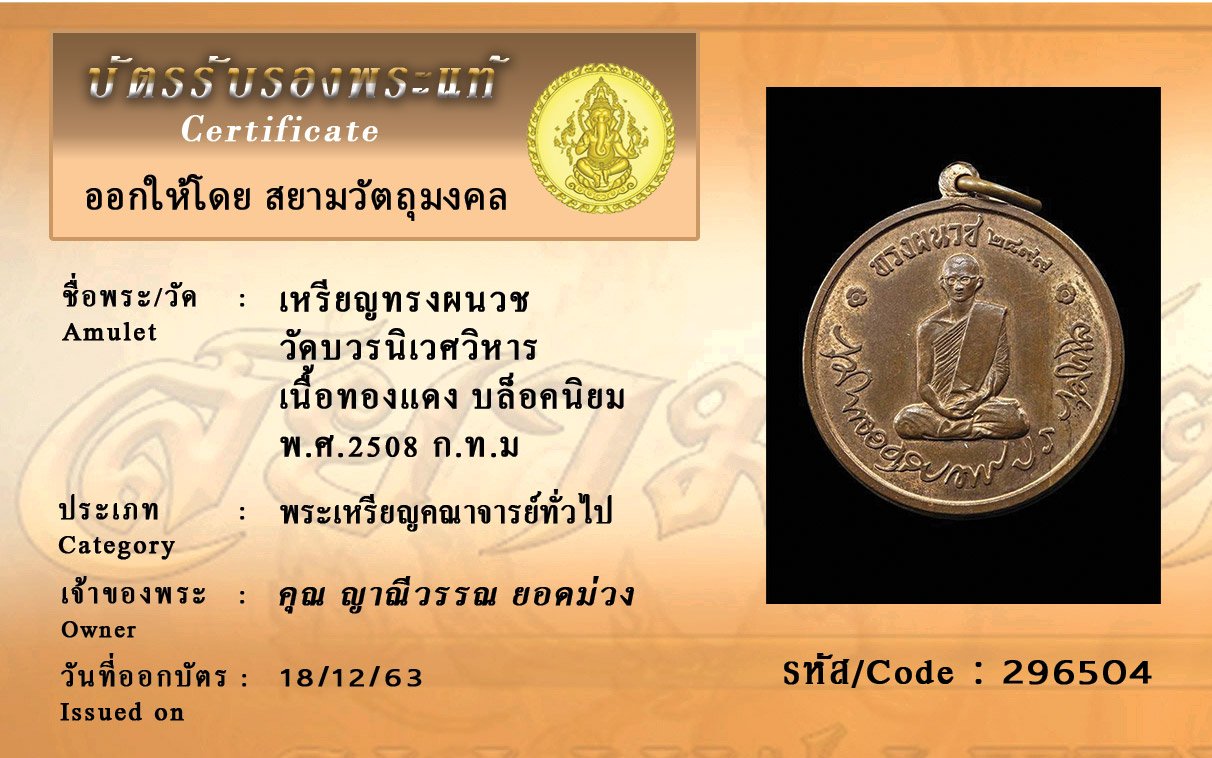รหัสสินค้า : 296504 เหรียญทรงผนวช วัดบวรนิเวศวิหาร พ.ศ.2508 เนื้อทองแดง บล็อคนิยม ก.ท.ม