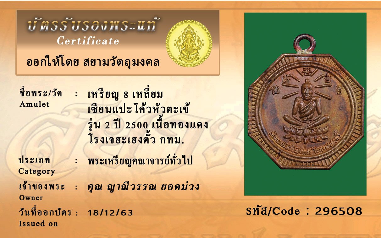 รหัสสินค้า : 296508 เหรียญเซียนแปะโค้วหัวตะเข้ 8 เหลี่ยม รุ่น 2 ปีพ.ศ 2500 เนื้อทองแดง โรงเจฮะเฮงตั้วกทม
