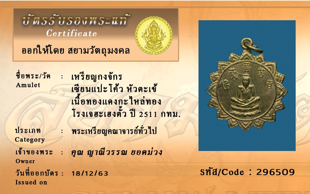 รหัสสินค้า : 296509 เหรียญกงจักร เซียนแปะโค้ว หัวตะเข้ เนื้อทองแดงกะไหล่ทองปีพ.ศ 2511 โรงเจฮะเฮงตั้วกทม