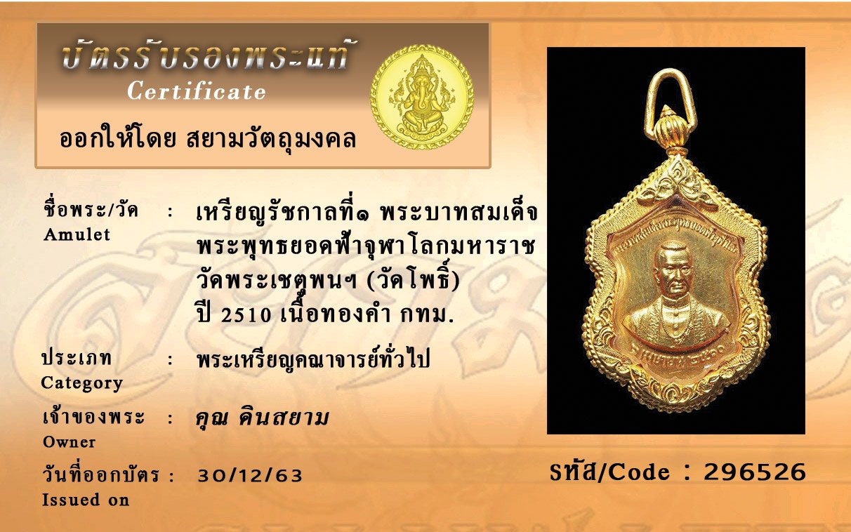 รหัสสินค้า : 296526 เหรียญพระบาทสมเด็จพระพุทธยอดฟ้าจุฬาโลกมหาราช รัชกาลที่ 1 วัดพระเชตุพนฯ (วัดโพธิ์) ปี 2510 เนื้อทองคำ จังหวัดกทม