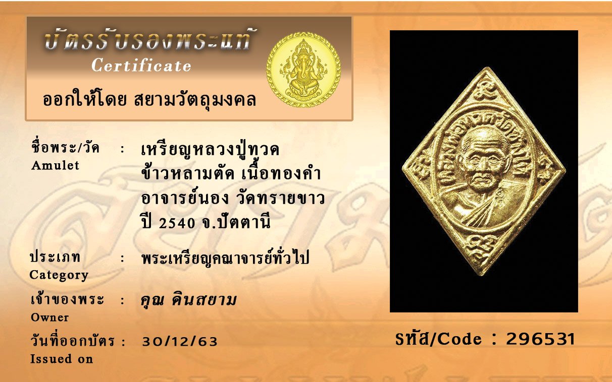 รหัสสินค้า : 296531 เหรียญหลวงปู่ทวดข้าวหลามตัด เนื้อทองคำ อาจารย์นองวัดทรายขาว ปีพศ 2540 จังหวัดปัตตานี