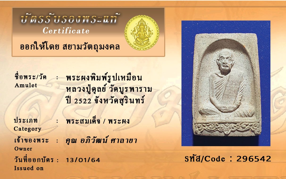 รหัสสินค้า : 296542 พระผงพิมพ์รูปเหมือนหลวงปู่ดุลย์ วัดบูรพาราม ปีพศ 2522 จังหวัดสุรินทร์