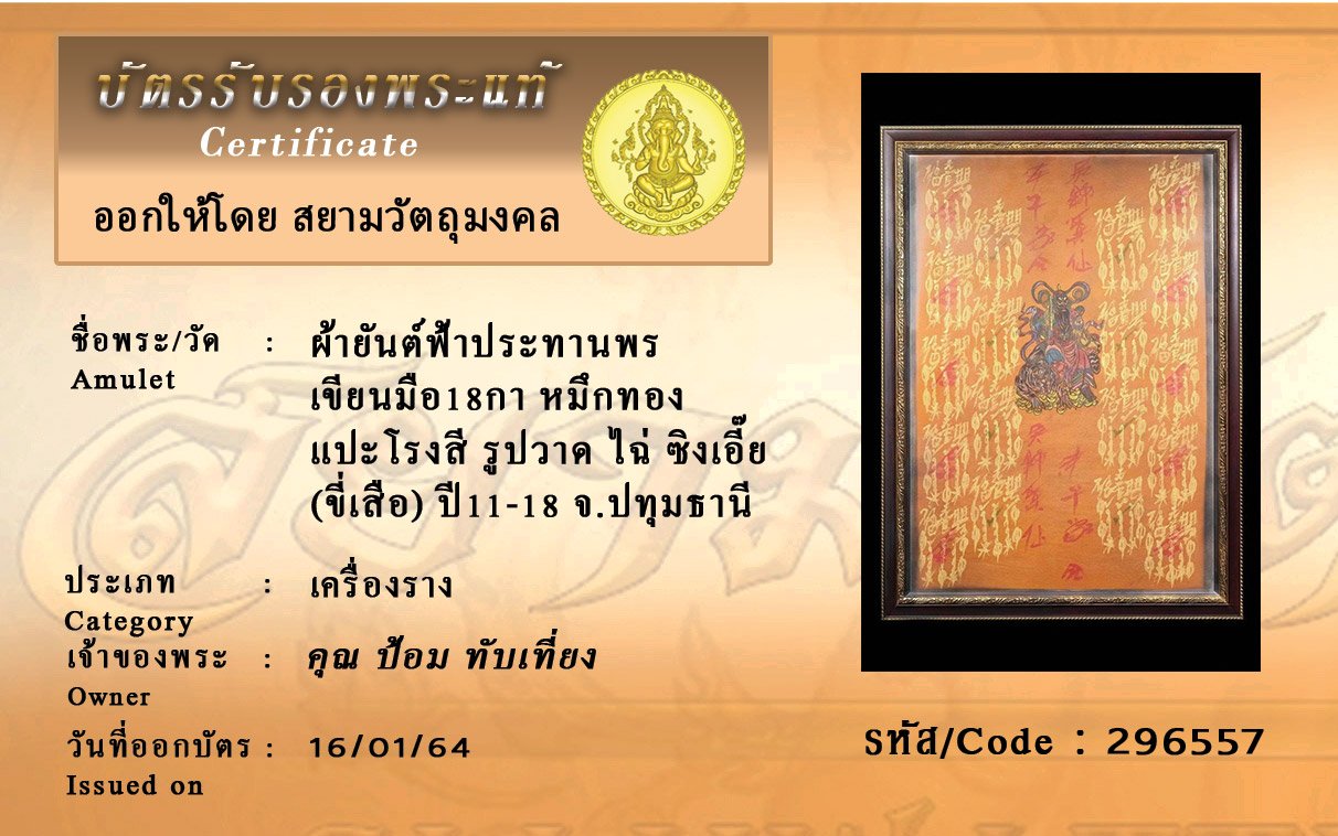 รหัสสินค้า : 296557 ผ้ายันต์ฟ้าประทานพร เขียนมือ18กา หมึกทอง แปะโรงสี รูปวาด ไฉ่ ซิงเอี๊ย (ขี่เสือ) ปี11-18 ชื่อ ป้อม ทับเที่ยง