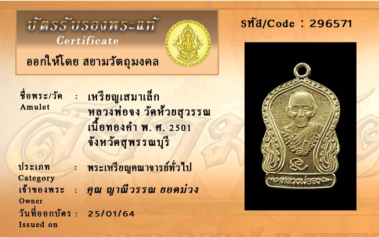 รหัสสินค้า : 296571 เหรียญเสมาเล็ก หลวงพ่อจง วัดห้วยสุวรรณ เนื้อทองคำ พ. ศ. 2501 จังหวัดสุพรรณบุรี