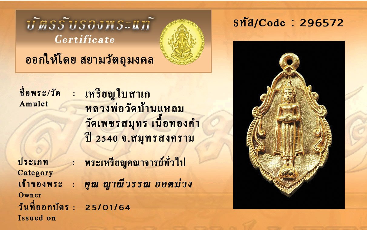 รหัสสินค้า : 296572 เหรียญใบสาเก หลวงพ่อวัดบ้านแหลม วัดเพชรสมุทร เนื้อทองคำปีพศ 2540 จังหวัดสมุทรสงคราม