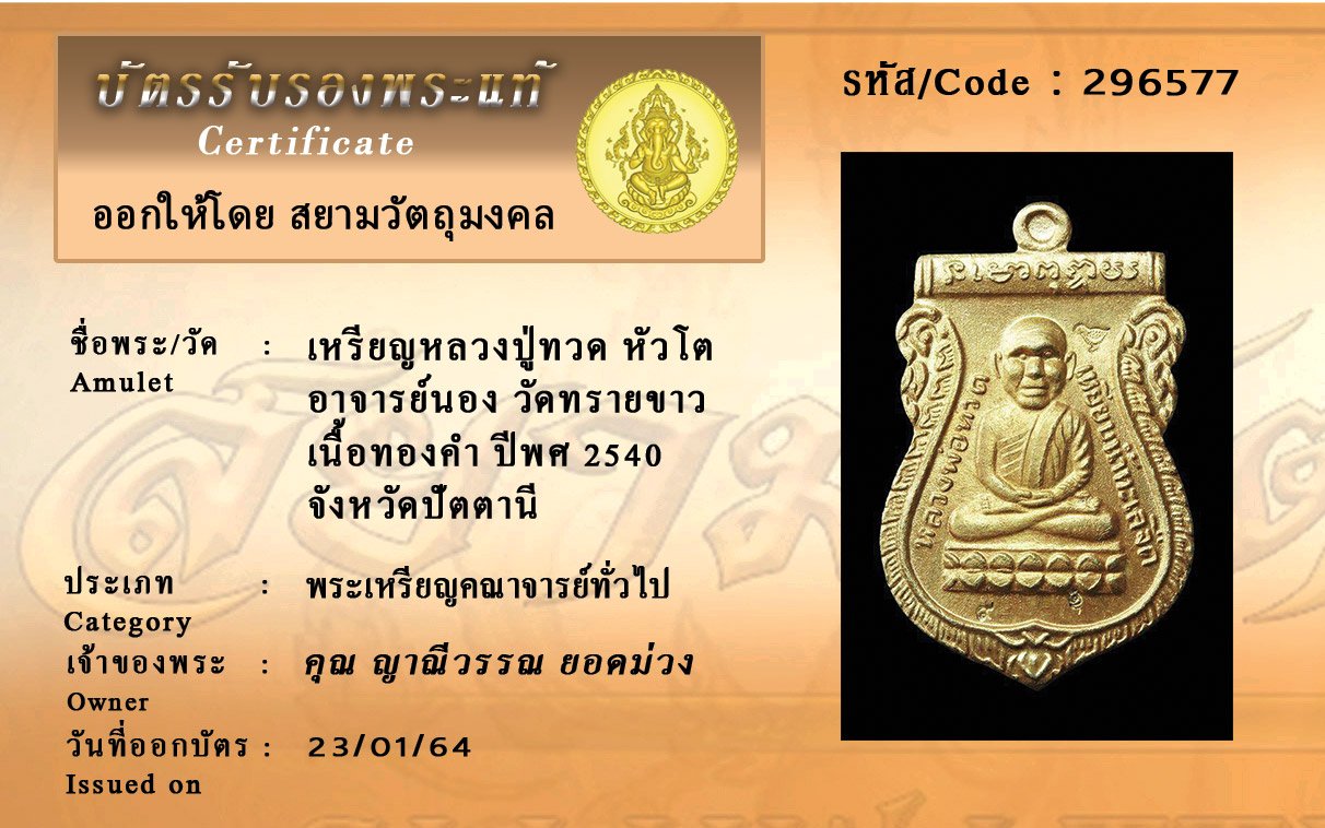 รหัสสินค้า : 296577 เหรียญหลวงปู่ทวดหัวโต อาจารย์นองวัดทรายขาวเนื้อทองคำ ปีพศ 2540 จังหวัดปัตตานี