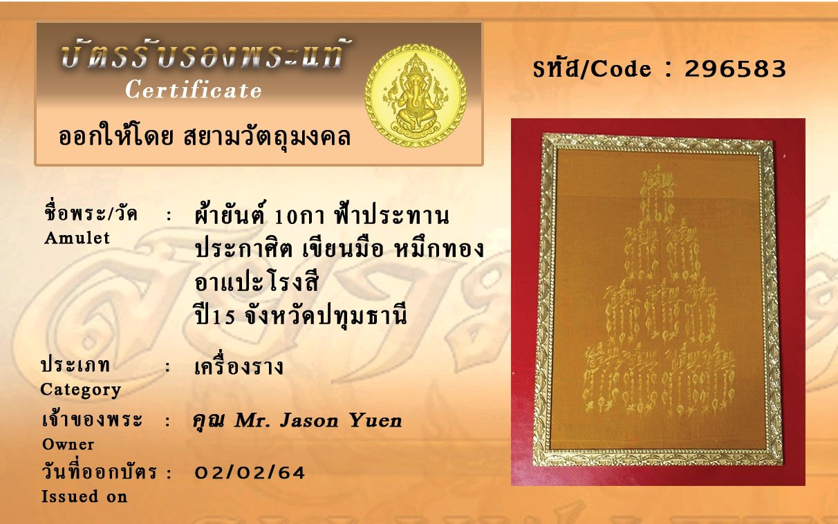 รหัสสินค้า : 296583 ผ้ายันต์ 10กา ฟ้าประทาน ประกาศิต เขียนมือ อาแปะโรงสี หมึกทอง ปี15 จังหวัดปทุมธานี