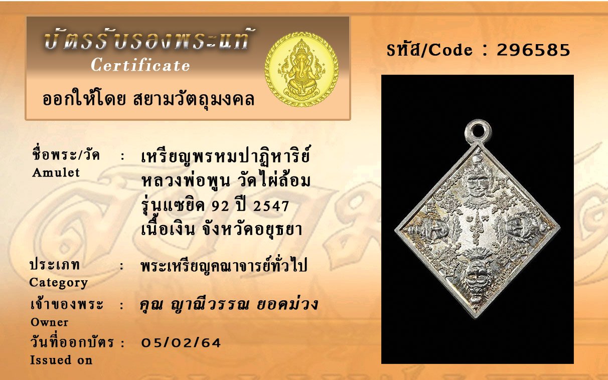 รหัสสินค้า : 296585 เหรียญพรหมปาฏิหาริย์หลวงพ่อพูนวัดไผ่ล้อม รุ่นแซยิด 92 ปีพ.ศ 2547 เนื้อเงิน จังหวัดอยุธยา