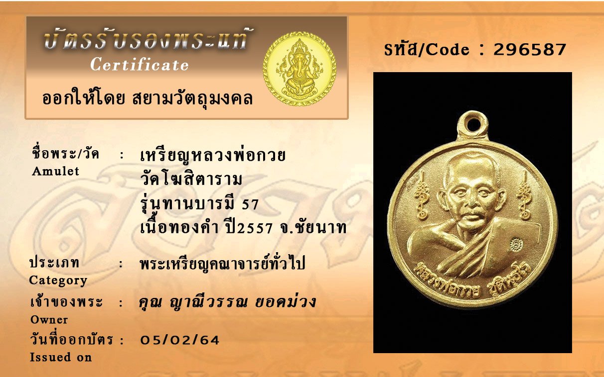 รหัสสินค้า : 296587 เหรียญหลวงพ่อกวยวัดโฆสิตาราม รุ่นทานบารมี 57 เนื้อทองคำ ปีพ.ศ 2557 จังหวัดชัยนาท