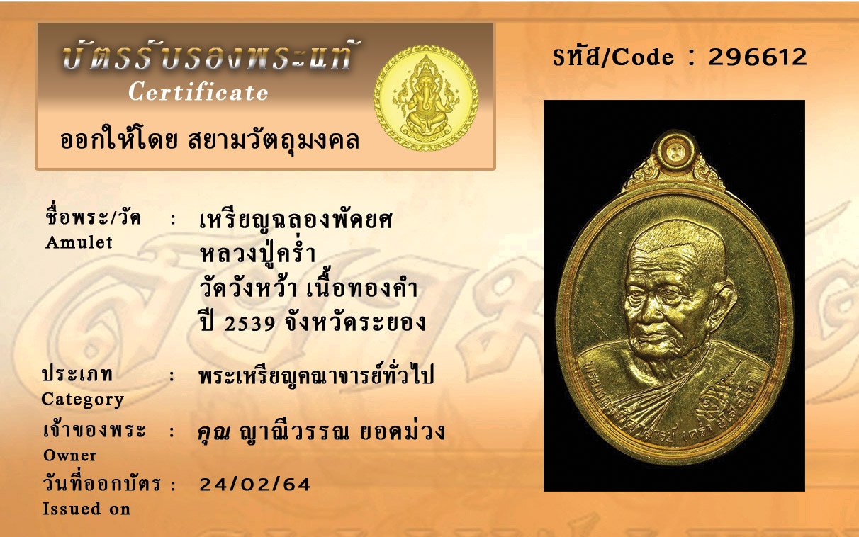 รหัสสินค้า : 296612 เหรียญฉลองพัดยศ หลวงปู่คร่ำ วัดวังหว้า จังหวัดระยอง เนื้อทองคำ พ. ศ. 2539