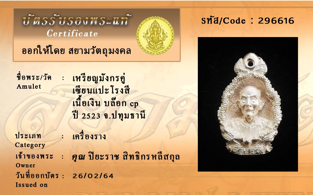 รหัสสินค้า : 296616 เหรียญมังกรคู่ เซียนแปะโรงสี เนื้อเงิน บล๊อก cp ปี2523 จ.ปทุมธานี