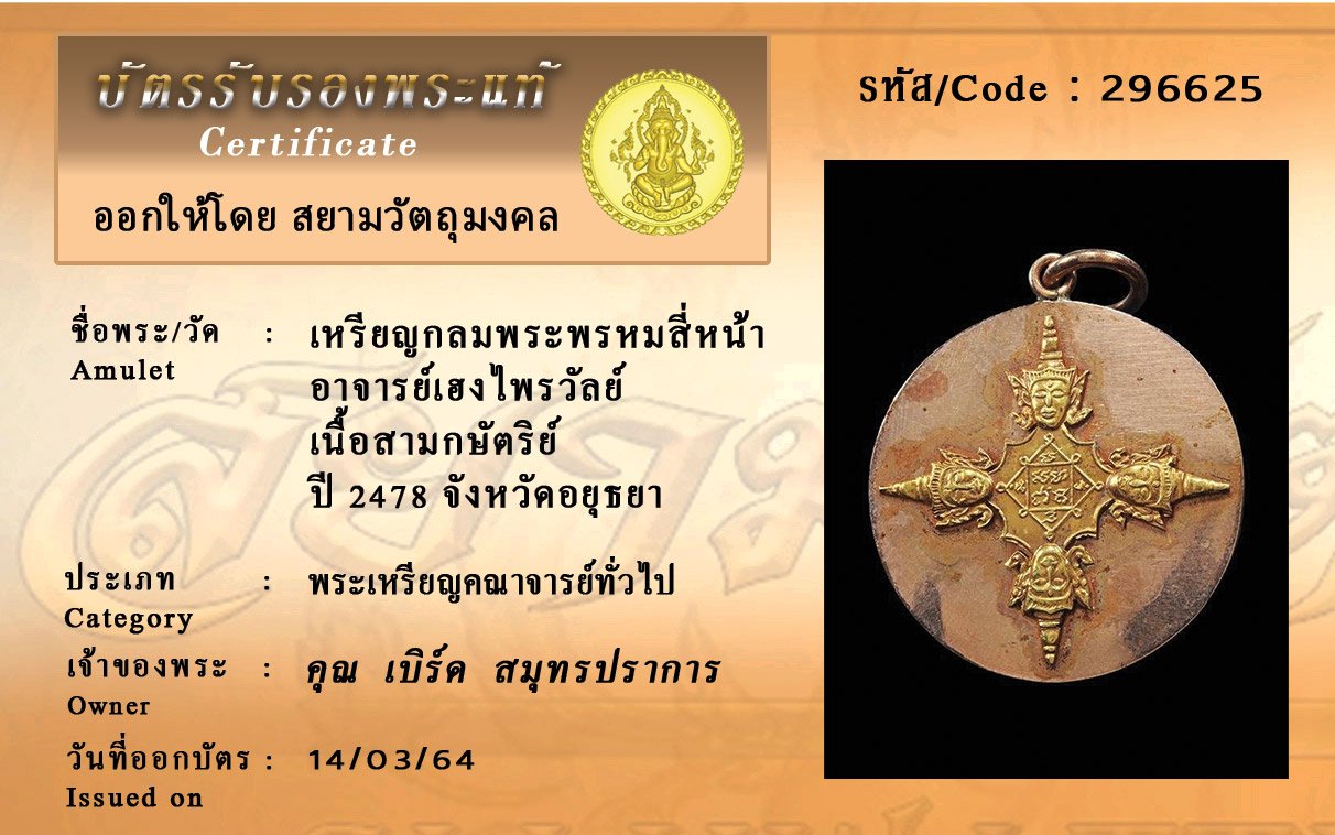 รหัสสินค้า : 296625 เหรียญกลมพระพรหมสี่หน้า อาจารย์เฮงไพรวัลย์ เนื้อสามกษัตริย์ ปี 2478 จังหวัดอยุธยา