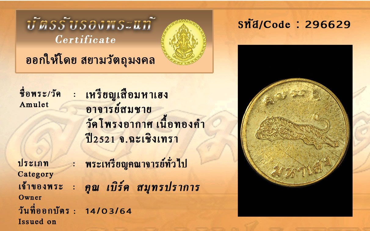 รหัสสินค้า : 296629 เหรียญเสือมหาเฮง อาจารย์สมชาย วัดโพรงอากาศ เนื้อทองคำ ปี2521 จ.ฉะเชิงเทรา